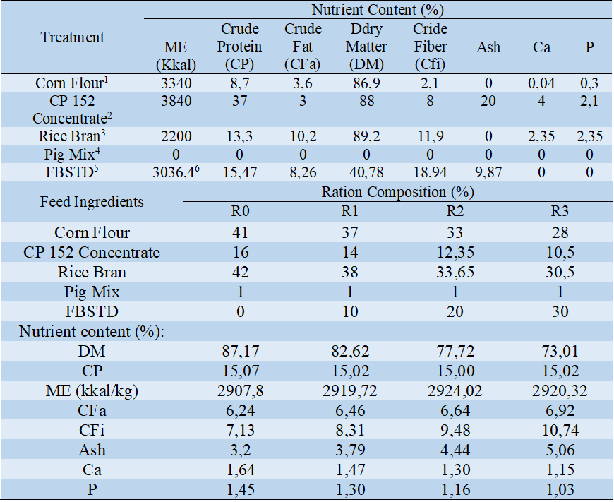 Banana stems and tofu dregs are agricultural and industrial waste that can be used as pig feed. However, the high crude fiber content requires fermentation technology to be used as pig feed. The purpose of this study was to examine the nutrient consumption of Landrace crossbred pigs consuming fermented banana stems tofu dregs (FBSTD) at different levels. This study was conducted in the pig pen of Rizky's farm from April to June 2025. The study used a Randomized Block Design (RBD) with 4 treatments and 3 replications. The research treatments were R0: Ration without FBSTD, R1: Ration containing 10% FBSTD, R2: Ration containing 20% FBSTD, and R3: Ration containing 30% FBSTD. The research data were analyzed using analysis of variance and Duncan's further test. The research variables were nutrient consumption (dry matter, crude fiber, crude fat, and ash). The results showed that increasing the percentage of FBSTD use (0%, 10%, 20%, and 30%) significantly affected (P<0.05) dry matter (DM) consumption and significantly affected (P<0.01) crude fiber (CFi) consumption, crude fat (CFa) consumption, and ash consumption. This also increased DM (1710.84±124,54 to 914.57±29,93 gram/head/day), CFa (132.55±9,65 to 216.19±3,38 g/h/d), and ash (212.15±15,44 to 251.54±9,78g/h/d) consumption and decreased CFi ((376.42±27,40 to 287.61±4,50g/h/d) consumption when using 20% FBSTD. In conclusion, the use of FBSTD increased DM, CFa , and ash consumption and decreased CFi consumption at the 20% level. It is recommended that FBSTD be used at 20% in grower pig rations.